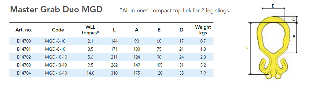 Anneau de Tête "tout en un" compact grade 100 avec raccourcisseur de chaîne intégré pour les élingues à 2 brins. Répond aux exigeances des normes : EN 1677:2008 (WLL +25%), ASTM A952/A952M, AS 3775:2015 et AS 3776:2015. Coefficient de sécurité 4:1