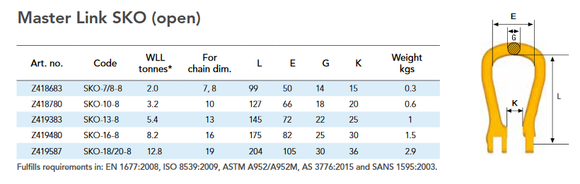 Anneau de tête ouvert pour système SK.Répond aux exigeances des normes : EN 1677:2008, ISO 8539:2009, ASTM A952/A952M, AS 3776:2015 et SANS 1595:2003.Coefficient de sécurité 4:1