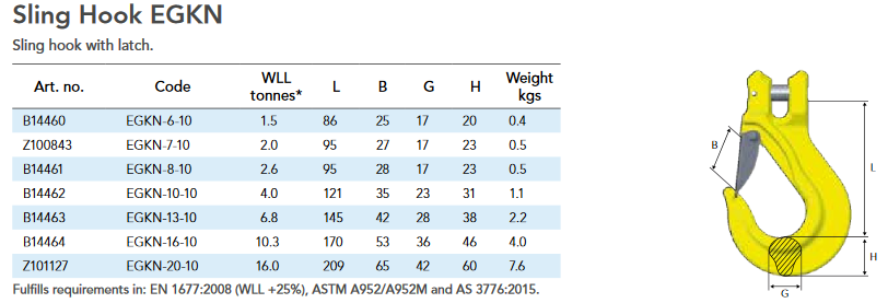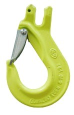 Crochet à chape à linguet grade 100.Répond aux exigeances des normes : EN 1677:2008 (WLL +25%), ASTM A952/A952M, AS 3775:2015 et AS 3776:2015Coefficient de sécurité 4:1