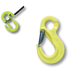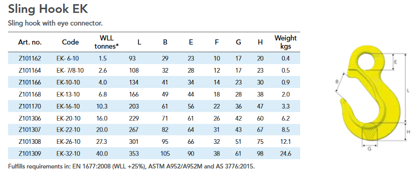Crochet à oeil sans linguet grade 100.Répond aux exigeances des normes : EN 1677:2008 (WLL +25%), ASTM A952/A952M, AS 3775:2015 et AS 3776:2015Coefficient de sécurité 4:1