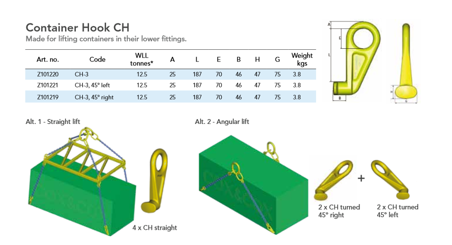 Crochet pour le levage de conteneur par le bas grade 100. Eiste en version droite ou tourné à gauche 45° et tourné à droite 45°. Charge maximale d'utilisation: 12t400.Coefficient de sécurité 4:1