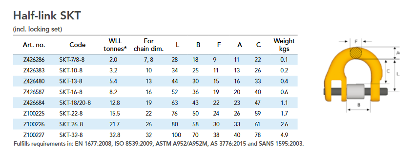 Demi-maille de connection avec axe et goupille pour système SK - SKT. Répond aux exigeances des normes : EN 1677:2008, ISO 8539:2009, ASTM A952/A952M, AS 3776:2015 et SANS 1595:2003. Coefficient de sécurité 4:1